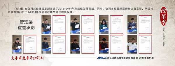 蛇年將逝,馬年將臨。2013年11月2日,浙江漢達(dá)機(jī)械有限公司的年度戰(zhàn)略會(huì)議拉開(kāi)了帷幕。公司總經(jīng)理斗志激昂,領(lǐng)銜宣讀了2014年年度戰(zhàn)略發(fā)展規(guī)劃。公司的經(jīng)理、車(chē)間主任、主管等各級(jí)領(lǐng)導(dǎo)們紛紛跟起簽名宣誓。