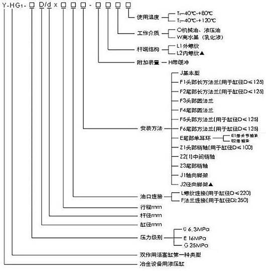 Y-HG1系列冶金設(shè)備用液壓缸為雙作用活塞缸,缸徑一般在40~320mm范圍內(nèi),工作壓力<=16MPA,其基本參數(shù),包括缸徑、桿徑、行程、油口尺寸。